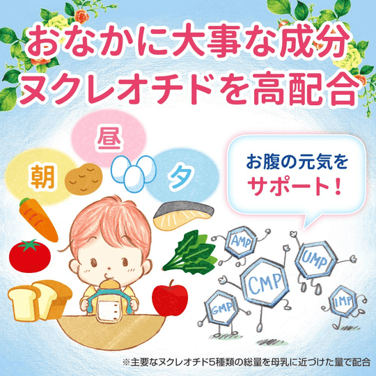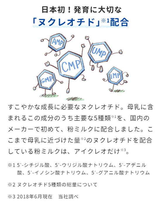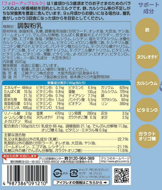 تتضمن مكونات هذا الحليب المجفف الحليب المجفف الخالي من الدسم (المصنع في كوريا), اللاكتوز, الزيوت والدهون المعدلة الصالحة للأكل (الشحم المكسر, الزيت الأوليو, زيت الصويا, زيت جوز الهند, بالم أوليين), منتجات تحلل النشا, تركيز بروتين الواي, مسحوق الواي المعزز بالبروتين, الجلاكتو-أوليغوسخاريد سكر سائل, زيت الإيجوما, والملح.