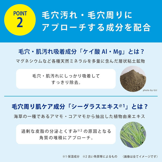 المكونات الرئيسية تشمل حمض الترانيكساميك (عامل تبييض فعال)، التريهالوز، محلول بولي ميثاكريلويلوكسي إيثيل فوسفو ريل كولين، 2-جلوكوسيد أسكوربات، مستخلص موكتسو، مستخلص الأعشاب البحرية (مرطب)، سيليكات الألومنيوم والمغنيسيوم (لامتصاص الأوساخ)، الماء، الجلسرين، DPG، محلول المالتيتول، ماء زهر البرتقال، سيتانول، BG، حمض الستيريك، حمض الميريستيك، حمض اللوريك، جليكوسيدات الألكيل، POE جليسيريل إيزوستيرات، محلول بوليمر أكريلاميد حمض الأكريليك وكلوريد ثنائي ميثيل دايليل أمونيوم، بوليوكسي بيوتيلين بولي جليسيرول ستيريل إيثر، كربوكسي ميثيل سليلوز الصوديوم، كلوريد الصوديوم، فوسفات 2Na، وهيدروكسيد البوتاسيوم.
