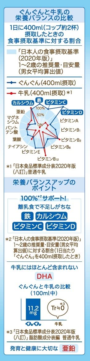 هذه التركيبة على شكل عصا مريحة للحمل أثناء التنقل أو لترتيب طعام الأطفال. توفر الدعم الغذائي الأساسي خلال فترة النمو ابتداءً من حوالي 9 أشهر، عندما يبدأ الأطفال بالأكل ثلاث مرات في اليوم. تعالج هذه التركيبة الفجوات الغذائية المشتركة الموجودة في حليب البقر والوجبات. تحتوي على DHA، والذي يصعب الحصول عليه من حليب البقر. من خلال استهلاك 400 مل في اليوم، فإنها تقدم 100% من الكميات الموصى بها يوميًا من الحديد، الكالسيوم، فيتامين C، وفيتامين D للأطفال في عمر 1-2 سنوات، بالإضافة إلى الزنك الجديد المضاف، والذي يعتبر ضروريًا للنمو.