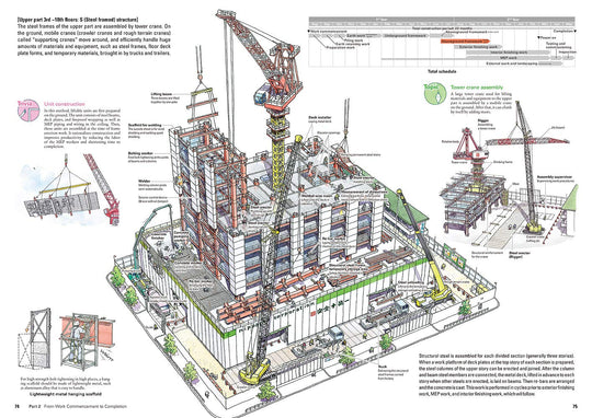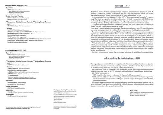 يُعد كتاب "عملية البناء اليابانية بالصور" ترجمة إنجليزية للكتاب الشهير "مقدمة في عملية البناء المصورة: فهم التشييد"، الذي نُشر لأول مرة عام 2017. يقدم هذا الكتاب دليلاً ثرياً لفهم الإنتاج المعماري في اليابان، ويستعرض أسلوب إدارة البناء الفريد الذي تطور هناك. من خلال الرسومات التفصيلية والجذابة، يسلط الكتاب الضوء على جوهر الإنجازات المعمارية اليابانية بعد الحرب العالمية الثانية. يهدف الكتاب إلى نقل متعة ودقة تقنيات البناء اليابانية إلى جمهور عالمي، بما في ذلك المهندسين الطموحين، والمهنيين العاملين، والطلاب سواء في اليابان أو خارجها.