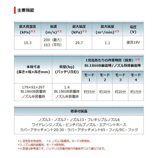 أبعاد الجسم: 179 مم (الطول) x 92 مم (العرض) x 297 مم (الارتفاع) (مع توصيل BL1860B بدون فوهة)