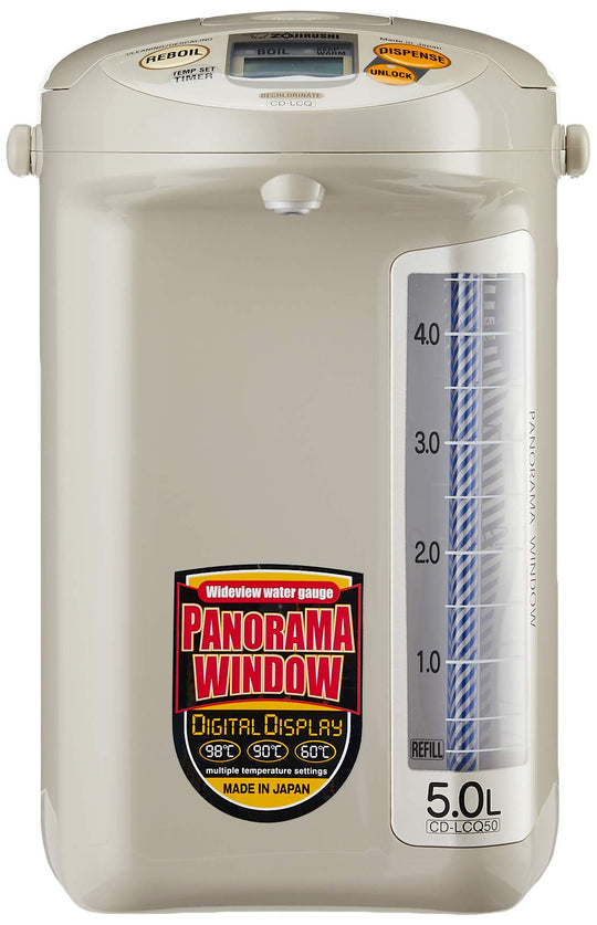 غلاية ZOJIRUSHI CD-LCQ50 TK الكهربائية ذات السعة الكبيرة مصممة للاستخدام في المناطق ذات الجهد الكهربائي من 220V إلى 230V. بفضل سعتها الكبيرة التي تصل إلى 5.0 لتر، فهي مثالية للأسر أو المكاتب التي تحتاج إلى كمية كبيرة من الماء الساخن. تتميز الغلاية بلون جسم أنيق "Herb Cocoa" وتصميم سهل الاستخدام، بما في ذلك نافذة بانورامية تتيح لك التحقق بسهولة من مستوى الماء المتبقي. يضمن الوعاء الداخلي المطلي بالفلورين النظافة وسهولة الصيانة. تتوفر شاشة العرض الرئيسية ودليل التعليمات باللغة الإنجليزية، مع دعم إضافي للدليل باللغة الصينية.