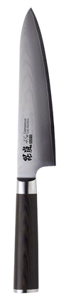Specs: blade hardness HRC 60 ±2 (post heat treatment); side material 18-0 stainless steel; bolster and end cap 18-0 stainless steel; handle made of laminated reinforced wood (brown). AUS10 Damascus construction with a forged, dense microstructure for excellent edge retention.