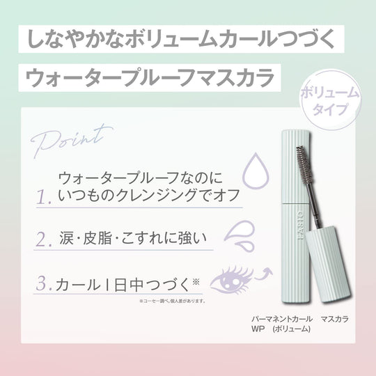 This waterproof, volumizing mascara enhances your lashes with a natural curl and volume, ensuring they look beautiful without feeling heavy. It allows for multiple coats to achieve your desired volume without clumping, making each lash appear thicker and longer. The mascara contains permanent curl ingredients and strong botanical waxes to maintain a long-lasting upward curl and natural shine. Despite its waterproof and sebum-proof formula, it is easy to remove with cleansing. The lightweight texture blends seamlessly with makeup and is designed to complement your skin tone. It offers long-lasting wear for up to 10 hours, based on internal research.