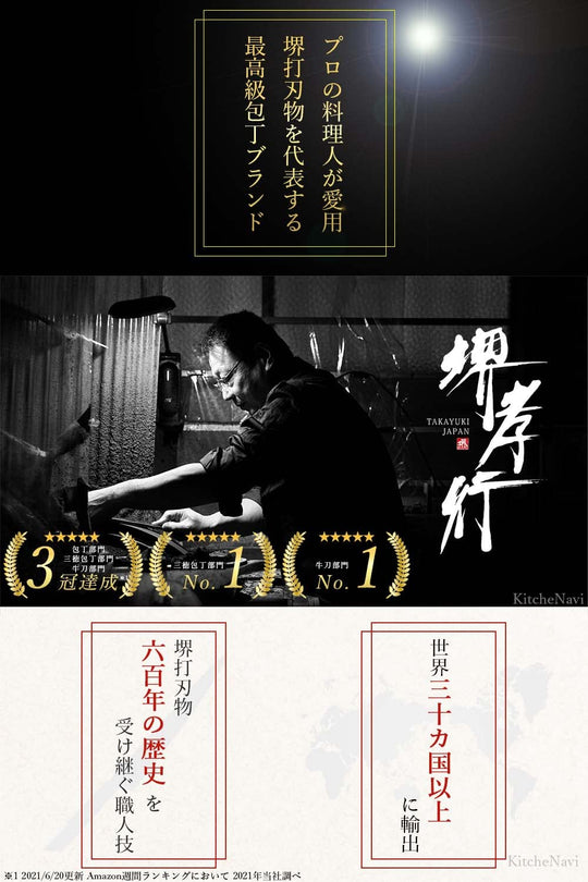 This special order item from the Sakai Takayuki brand features a stunning Damascus pattern, a hallmark of Sakai Uchihamono kitchen knives. Created through a collaboration between KitcheNavi and Sakai Takayuki cutlery, this knife is perfect for those seeking a higher-grade kitchen tool. The Gyuto kitchen knives, favored by professional chefs, will significantly enhance your cooking skills. Sakai Uchihamono boasts a market share of over 90% among professional chefs' knives, making this a top-quality product. The blade's mirror finish accentuates the elegant Damascus pattern, turning this kitchen knife into a work of art crafted by traditional artisans.