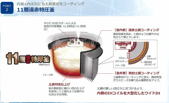 Pressure induction cooker with 11-layer far-infrared special pressure cooker. Boils with fine bubbles like an earthenware pot. The IH coil has been enlarged to achieve a wide IH range. Earthenware convection finish