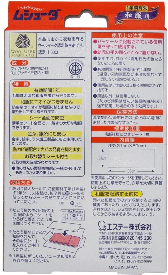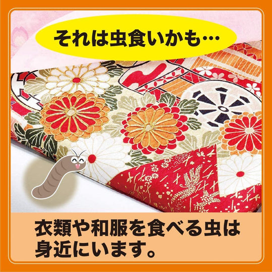 This fiber product insect repellent is specifically designed for Japanese-style clothes, including kimonos. The thin sheet protects each garment individually and is safe for use on gold and silver threads as well as lame-processed products. The product includes a replacement sticker to indicate when it's time to replace the sheet. It can be used in conjunction with other fiber insect repellents for added protection.