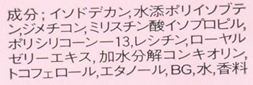 The product contains Isododecane, hydrogenated polyisobutene, dimethicone, isopropyl myristate, polysilicone-13, lecithin, royal jelly extract, hydrolyzed conchiolin, tocopherol, ethanol, BG, water, and fragrance.