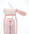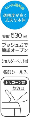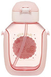 This product is a straw drinking spout water bottle, perfect for children learning to drink through a straw. It is made of durable and highly transparent saturated polyester resin, ensuring longevity and clarity. The bottle features a cap lock design that prevents the cap from returning when drinking, making it easy to use. It also has a push button for easy opening. The lightweight and compact design of the bottle makes it easy for even children to carry. It comes with a shoulder strap and a name sticker for personalization. The bottle also has a shock-absorbing cushion on the bottom for added durability. Please note that this bottle is not suitable for use in dishwashers or dishwashers/dryers.