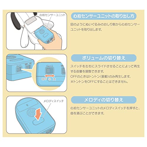A plush toy designed to support baby's sleep, featuring melodies and vibrations tailored to each baby's individual needs. This Snoopy-themed plush toy is suitable for newborns and up, equipped with a heart rate sensor that vibrates in sync with the baby's heart rate and plays melodies at a corresponding speed. This innovative design aims to create a comforting environment that helps babies fall asleep more easily. The toy includes a variety of built-in sounds, such as womb sounds, nature sounds (2 types), and melodies (5 songs), including Linus and Lucy, Twinkle Twinkle Little Star, Ave Maria, Cradle Song, and Brahms' Lullaby. An auto-timer function stops the toy after approximately 30 minutes for added convenience. Please note, the heart rate sensor unit is not waterproof.