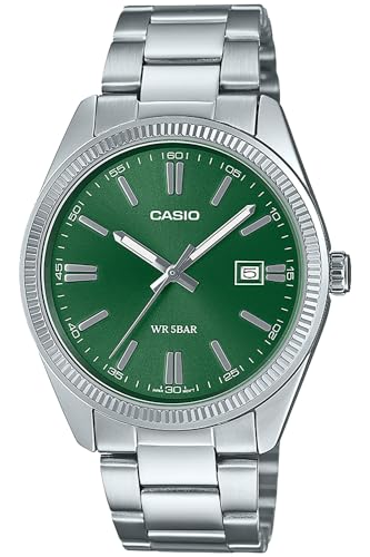 The CASIO Collection introduces a stylish three-hand date analog watch in a striking green color. This elegant timepiece features a simple design with bar indexes, ensuring easy readability. A small window l...