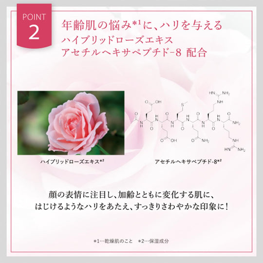 Mit Retinylpalmitat, Hyaluronsäure (einschließlich Crosspolymer), Ceramiden (NP/NG/AP), Squalan und Peptiden (Acetyl Hexapeptide-8, Dipeptide Diaminobutyroyl Benzylamide Diacetate) sowie pflanzlichen Ölen wie Jojoba, Macadamia, Mandel, Wiesenchaumkraut und Erdnuss sowie Hybridrosenextrakt. Formuliert mit RF-/EMS-unterstützenden pH-Regulatoren – Zitronensäure und Natriumcitrat –, um eine angenehme Anwendung und die Feuchtigkeitsversorgung zu erhalten.