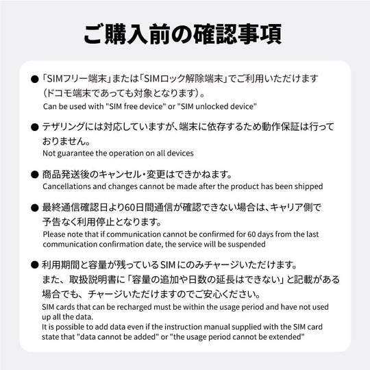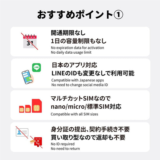 Diese Prepaid-SIM-Karte ist nur für die Datenkommunikation konzipiert und kompatibel mit SIM-freien Handys. Sie kann nicht für Sprachanrufe, SMS oder MMS verwendet werden. Die SIM-Karte ist bis zu 180 Tage ab Aktivierung gültig, und das Verfallsdatum ist in der Bedienungsanleitung angegeben, die dem Produkt beiliegt. Bitte beachten Sie, dass die SIM-Karte auch dann nicht mehr verfügbar ist, wenn das Ablaufdatum überschritten wird, selbst wenn seit der Aktivierung noch keine 180 Tage vergangen sind. Die SIM-Karte gibt es in einer 3-in-1-Größe, kompatibel mit Standard-SIM, Mikro-SIM und Nano-SIM. Sie kann leicht mit dem beigefügten schmalen Schlitz abgetrennt werden. Sollte das Abtrennen der SIM-Karte jedoch nicht gelingen, wird dies nicht garantiert. Die SIM-Karte kann auch bei aufgebrauchtem Datenvolumen bis zum Ablaufdatum mit niedriger Geschwindigkeit (32Kbps) genutzt werden. Bitte beachten Sie, dass diese SIM-Karte nur für den Inlandsgebrauch bestimmt ist und nicht im Ausland verwendet werden kann. Sie ist kompatibel mit SIM-unlocked Handys und SIM-freien Handys, aber nicht mit Docomo-locked Handys. Wenn Ihr Handy eine Tethering-Funktion hat, können Sie die Datenkommunikation teilen und eine Hochgeschwindigkeitskommunikation genießen. Dieses Produkt verwendet "docomo line" als Mobilfunkbetreiber, daher stellen Sie bitte sicher, dass Ihr Smartphone mit der Kommunikationsbandbreite von docomo kompatibel ist und SIM-unlocked ist, bevor Sie es kaufen.