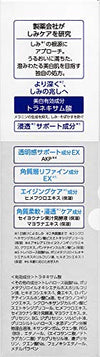 Die Lotion beinhaltet eine Mischung aus aktiven und anderen Inhaltsstoffen. Der aktive Inhaltsstoff ist Tranexamsäure. Weitere Inhaltsstoffe sind Natrium-Trehalose-Sulfat, Polyacryloylphosphorylcholin-Lösung, Hikiokoshi-Extrakt-1, Maulbeerextrakt, D-Pantetheinsulfonat Ca-Lösung, Sägeblumenextrakt, Bis-Ethoxydiglykol-Cyclohexandicarbonsäure, japanischer Stockrose-Extrakt, japanisches Birnensaft-Fermentationsflüssigkeit, Majonaise-Extrakt, Wasser, Glycosyltoluensulfonat-Lösung, Diglycerinsulfonat und Glycerin, BG, Diglycerin, Sorbitlösung, Glykosyltehalose/Hydrogenierte Stärkeabbauprodukte Mischlösung, Xanthangummi, Zitronensäure, PEG(80), Ethanol, (Eicosandisäure/Tetradecandisäure) Decaglycerin-Lösung, Konzentriertes Glycerin, Natriumcitrat, Phenoxyethanol und Methylparaben.