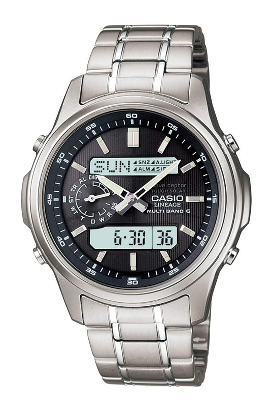 Diese Herrenuhr ist ein hochfunktionales, solarbetriebenes und funkgesteuertes Zeitmessgerät, das für Benutzerfreundlichkeit und Praktikabilität entwickelt wurde. Sie verfügt über zwei LCD-Displays, eines oben und eines unten, die klar die Weltzeit und die Alarmeinstellungen anzeigen. Ein kleiner Zeiger auf der 9-Uhr-Position zeigt den aktuellen Modus an, was die Bedienung intuitiv und benutzerfreundlich macht. Die Uhr gehört zur vollmetallischen, funkgesteuerten Solaruhr-Serie LINEAGE von CASIO, die für ihre fortschrittliche Funktionalität und ihr robustes Design bekannt ist.
