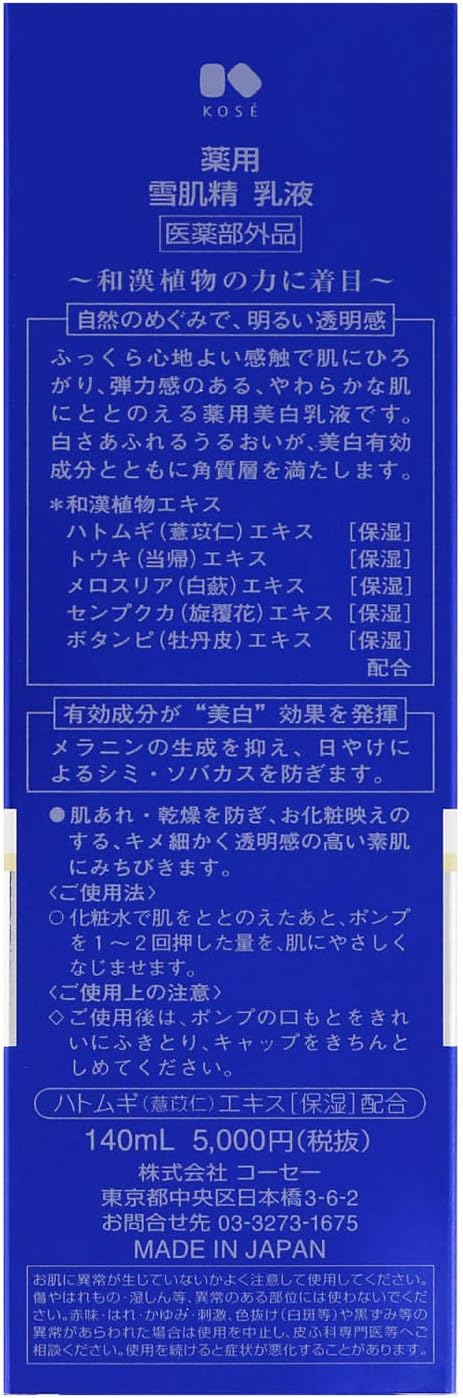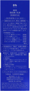 KOSE YAKUHADA SEI MILK 140ml is a medicated milky lotion designed to suppress melanin production and prevent sun spots and freckles caused by sunburn. This product helps to prevent roughness and dryness of the skin, leading to a fine, translucent complexion that enhances the appearance of makeup. It is classified as a quasi-drug and is made in Japan.