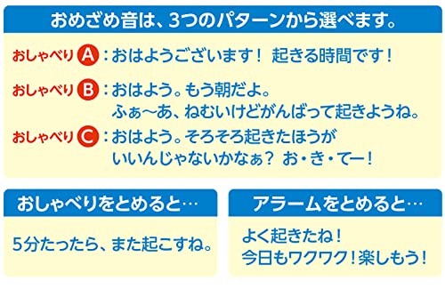 The character clock is a popular clock designed with a motif of Dorayaki, a sweet bean paste snack. It features three selectable alarm patterns with chatter responses and a snooze function. The clock has an analog display with Arabic numerals to help children learn how to read the time. The alarm time is announced by voice synthesized on the IC. The volume of the melody and alarm sound can be adjusted, and the second hand moves smoothly and continuously. The clock comes with batteries and an alarm monitor.