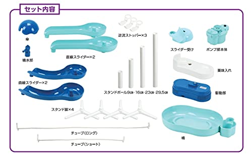 Tub, drive unit, condiment container, pump unit, slider holder, umbrella, fountain unit, straight slider x 2, curved slider x 2, backflow stopper x 3, stand pole (9cm, 16cm, 23cm, 29.5cm), tube (short), tube (long)