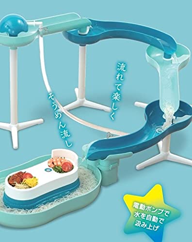 Experience the fun and excitement of somen-nagashi with the Nagaremen Slider Somen Noodle Floaters. This innovative product allows you to catch somen noodles as they flow down an angled slider, providing a unique and enjoyable dining experience. The slider's shape can be adjusted to fit the space of your dining table, offering various configurations such as zigzag, U-turn, and straight types. The electric pump automatically pumps up water, and the battery-powered design makes it perfect for outdoor use.