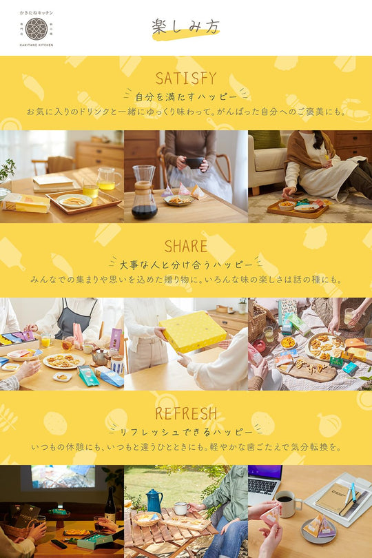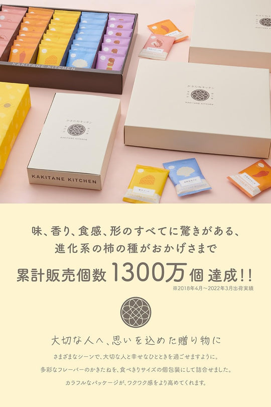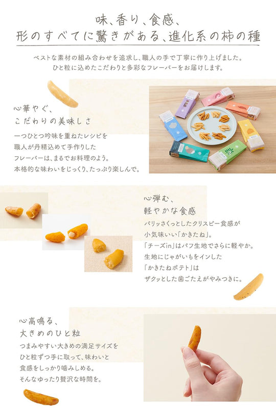 The Kakitane Kitchen Kakitane Assortment is a collection of individually wrapped packages of Kakitanekitchen's classic flavors. This assortment includes 24 bags, with 6 bags of each of the 4 flavors, making it a perfect size for souvenirs. The flavors include Luxury Cheese, Sweet Soy Sauce After Spicy, Seafood-Style Salt Sauce, and Japanese Teriyaki Soy Sauce Flavor. Please note that the "Ama Shoyu no Ato Koshari" has a spicy taste, so those who do not like spicy food should be careful. Also, the "Japanese Teriyaki Soy Sauce Flavor" contains honey, so it should not be given to infants under 1 year old.
