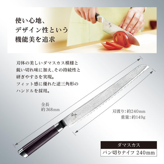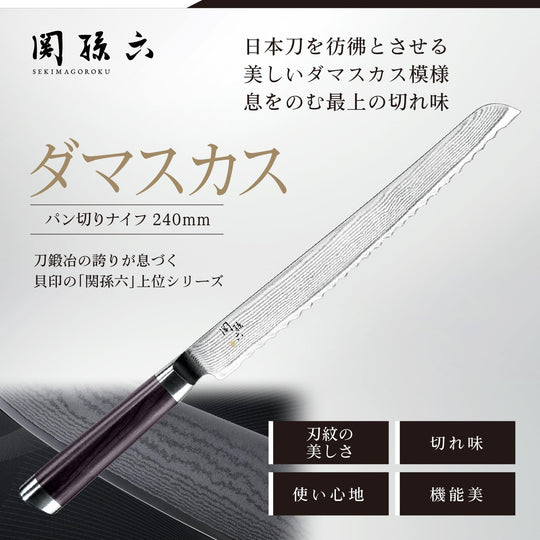 KAI Sekisoroku Damascus Steel Bread Knife 240mm Made in Japan Professional Kitchen Cutlery