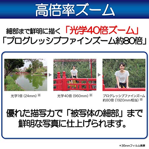 - High-power zoom model with 24mm-960mm wide-angle lens and 40x optical zoom.
