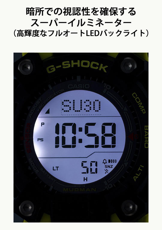 Introducing the G-SHOCK MASTER OF G series, a collection of watches designed for use in challenging environments. This model features a robust black body paired with a striking caution-colored yellow band, embodying toughness and resilience. Equipped with Casio's innovative solar charging system, the watch ensures reliable performance by combining a solar panel with a high-capacity rechargeable battery. This is the first model from Casio to feature a radio-controlled time display, providing precise timekeeping by receiving radio waves.