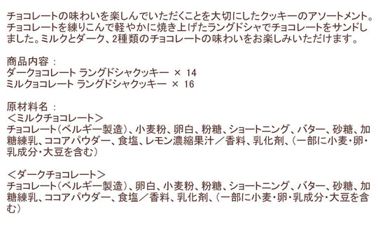 Chocolate con Leche: Chocolate (fabricado en Bélgica), harina de trigo, clara de huevo, azúcar en polvo, manteca vegetal, mantequilla, azúcar, leche condensada azucarada, cacao en polvo, sal, jugo de limón concentrado, saborizante, emulsionante (contiene trigo, huevo, leche y soja). Chocolate Amargo: Chocolate (fabricado en Bélgica), clara de huevo, harina de trigo, azúcar en polvo, manteca vegetal, mantequilla, azúcar, leche condensada azucarada, cacao en polvo, sal, saborizante, emulsionante (contiene trigo, huevo, leche y soja).