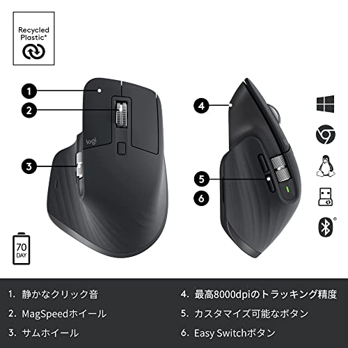 El ratón soporta la característica única FLOW de Logitech, que permite la transferencia de datos de texto, imágenes y archivos entre hasta tres computadoras/sistemas operativos con un simple arrastre, facilitando la operación sin interrupciones entre Windows y macOS. El botón Easy-Switch en la parte trasera del dispositivo permite cambiar fácilmente entre hasta tres dispositivos conectados. La batería recargable tipo USB-C-A soporta una recarga de alta velocidad, ofreciendo 3 horas de uso con solo 1 minuto de carga y hasta 70 días con una carga completa. El producto viene con una garantía del fabricante de 2 años.