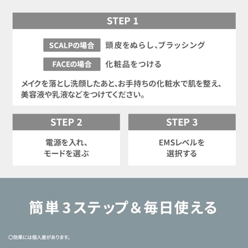Experimenta un cuidado avanzado de elevación desde la cabeza con nuestro dispositivo innovador. Diseñado para ser utilizado con un movimiento de tracción hacia arriba, este dispositivo está equipado con dos tipos de tecnología EMS (Estimulación Muscular Eléctrica) patentada, desarrollada basándose en la ciencia de los músculos de la cabeza y la cara. El "Cepillo Flotante Activo" se centra eficientemente en los músculos de la cabeza, mientras que el poder de los iones ayuda a que los ingredientes de belleza de los cosméticos penetren profundamente en la capa queratinizada de la piel.