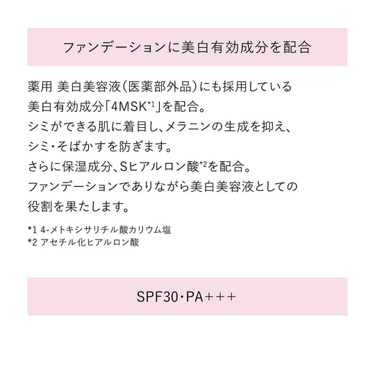 La base de maquillaje HAKU Brightening está diseñada para integrarse perfectamente con la piel, cubriendo eficazmente las imperfecciones mientras ofrece un cuidado blanqueador. Contiene ingredientes activos que ayudan a suprimir la producción de melanina, previniendo manchas y pecas. La base se aplica de manera ligera, asegurando una cobertura uniforme sin resaltar imperfecciones, y mantiene un aspecto fresco e hidratado durante largos periodos. El resultado es un cutis luminoso, natural y radiante.