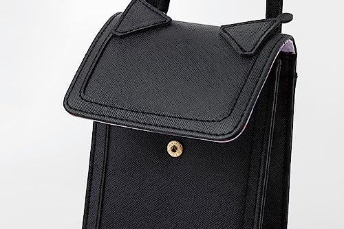 Este producto es una elegante y práctica bolsa para el hombro para smartphones, con el diseño de Kuromi, un querido personaje de Sanrio. No solo puede llevar su teléfono móvil, sino que también tiene espacio para su lápiz de labios y otros cosméticos que lleva consigo. La bolsa está hecha de un material similar al cuero negro, con la cara de Kuromi estampada en dorado para un aspecto sencillo pero lujoso. Una característica destacada son las orejas puntiagudas de la capucha distintiva de Kuromi, que añade un toque único al diseño. El forro de la bolsa presenta un lindo patrón de Kuromi y artículos de moda por todo el anime. La bolsa también incluye cuatro bolsillos para tarjetas en el interior y un cierre con botón a presión para mayor comodidad. La correa es ajustable en longitud, lo que la hace versátil para diferentes usos. Esta bolsa es perfecta para viajes cortos o como bolsa de viaje.