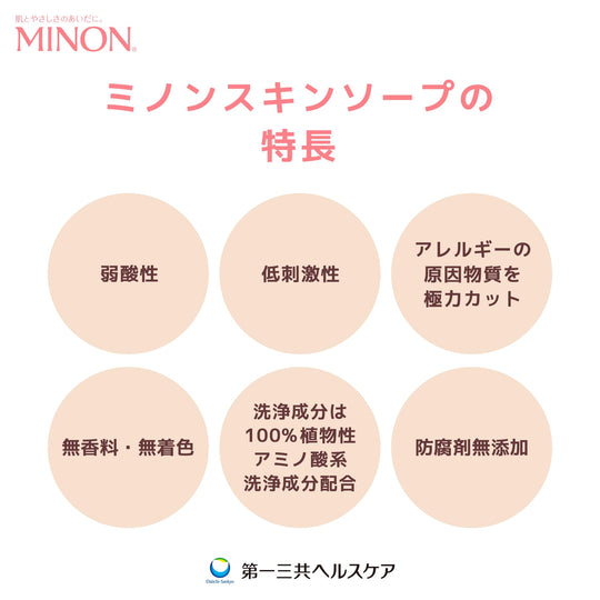 Ang Minon Skin Soap ay isang banayad na sabon na idinisenyo upang linisin habang pinoprotektahan ang natural na hadlang ng balat. Binuo ito na may pokus sa pag-minimize ng iritasyon sa balat, kaya't perpekto ito para sa mga indibidwal na may sensitibo o tuyong balat, kabilang ang mga may kaliskis, pulbos, o maselang kondisyon ng balat. Ang simpleng pormula nito ay nagbibigay ng moisturizing na paghuhugas na hindi nag-aalis ng natural na kahalumigmigan ng balat, kaya't angkop ito para sa lahat ng edad, mula sa mga sanggol hanggang sa matatanda. Ang sabon ay hypoallergenic, bahagyang acidic, walang kulay, at walang pabango, na tinitiyak na hindi ito naglalagay ng hindi kinakailangang stress sa balat.