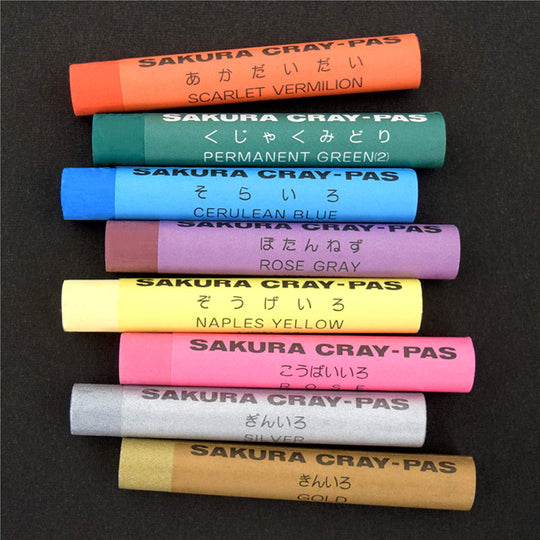 Kasama sa set ang iba't ibang kulay tulad ng emerald green, viridian, light blue, sky blue, blue, green, airo, akaru murasaki, murasaki, violet, light dai dai dai, momo iro, kobai iro, usubini iro, kubibai iro, olive, hodan nezu, oudo iro, kiicha, akatsuichi iro, cha iro, dark brown, sepia, white, hairoi iro, kurai hairo iro, black, gold, at silver. Ang mga krayolang ito ay ginawa ng Sakura Craypas, isang kilalang tatak, na nagtitiyak ng mapagkakatiwalaang kalidad at marangyang hanay ng kulay na nagpapasaya sa pagguhit.