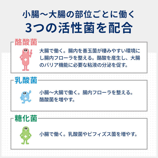 - Porma: Tableta, nasa bote - Aktibong Bakterya: 1. Saccharomycetes (nagpaparami ng lactobacilli at bifidobacteria) 2. Butyric acid bacteria (sumusuporta sa paggana ng bituka at gumagawa ng butyric acid) 3. Lactobacilli (nagpapalago ng butyric acid bacteria) - Benepisyo: 1. Pinapabuti ang flora ng bituka at hadlang ng colon 2. Nagre-regulate ng araw-araw na pagdumi 3. Nagpo-promote ng malusog na porma ng dumi 4. Nagpapagaan ng pakiramdam ng paninikip at hindi komportable sa tiyan - Inirerekomenda para sa: 1. Mga indibidwal na madalas makaranas ng pagtitibi 2. Mga may maluwag na dumi 3. Mga taong nais mapabuti ang kalusugan ng bituka at pagtunaw