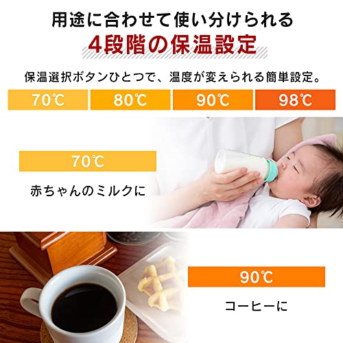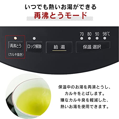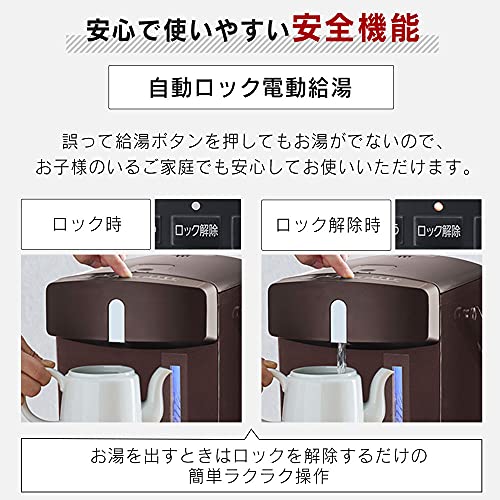 Produkto na Available sa tatlong kulay: itim, pulang blackcurrant at tsokolateng cocoa para magdagdag kulay sa iyong kusina.Kuweradong porma na may estiloAng kuweradong hugis nito ay nagbibigay ng slim at compact na impresyon.angkop para sa malawak na gamit mula sa bahay hanggang opisina. Diseynong simple at madaling gamitin.Maaaring gamitin ang setting na panatilihin ang init na naaayon sa iyong mga pangangailangan.Madaling setting ng temperatura gamit lamang ang iisang button para piliin ang keep-warm.Maari mong i-check ang status ng pananatili ng init at pagkukulo, pati na rin ang natitirang antas ng tubig ng sa isang sulyap lang.Ang salaming tube sa window ng antas ng tubig ay nagbibigay liwanag na pula kapag ang tubig ay kumukulo, at asul kapag ang tubig ay panatilihin ang init.Ang salaming tube sa window ng antas ng tubig ay nagbibigay liwanag na pula kapag ang tubig ay kumukulo, at asul kapag ang tubig ay panatilihin ang init. Re-boiling na mode para sa mainit na tubig sa anumang orasRe-boils tubig habang nag-iinit na alisin ang chlorine.Ang mainit na tubig ay maaaring gamitin nang walang malasang amoy ng maapong tubig.Mga tampok ng kaligtasan na madali at safe gamitin.Awtomatikong lock na electric hot water supply upang hindi magtakbo ng hot water kahit ma-press accidentally ang button ng hot water, ginagawang safe ito kahit para sa mga pamilyang may na mga bata.Empty vessel prevention functionKung ang kuryente ay bubuksan habang walang laman ang container, lahat ng mga lampara maliban sa unlock lamp ay kikindat para huminto ng pag-init.Magnetic plugKahit na maipit ang kamay o paa sa plug, maaaring maputol ang cord nang walang pag-aalala. Madaling malinisAng coating na fluorine ay ginagamit upang maiwasan ang mga dumi na dumikit sa ibabaw.Ang takip ay removable para sa madaling pag-supply ng tubig at paglilinis.Mga babala (Disclaimer) Mangyaring basahin ng maigi.Berbeng Panahon: 1 taon mula sa araw ng pagbili. Mangyaring basahin ng mabuti ang mga paalala na inilarawan sa manual ng instruksyon bago gamitin.