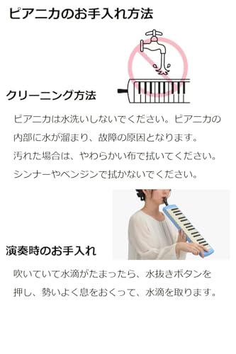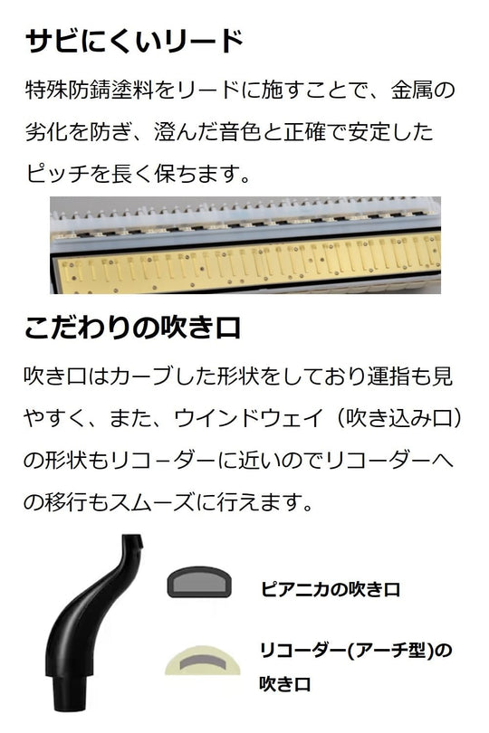 Sa saklaw mula f hanggang c''', ang pianica ay nag-aalok ng malinaw at mayamang tunog na angkop para sa iba't ibang antas ng edukasyon. Ang bagong pipe clip, na may patent pending, ay nagse-secure ng tubo habang tumutugtog, maging ito man ay hawak ng kamay o nasa ibabaw ng mesa. Ang hawakan ng case ay dinisenyo para sa madaling paghawak ng maliliit na kamay, at ang konstruksyon nito ay pumipigil sa pagtagas ng hininga, na tinitiyak ang tuluy-tuloy na karanasan sa pagtugtog.