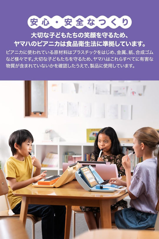 Ang 32-key Yamaha pianica na ito, na kilala rin bilang keyboard harmonica, ay dinisenyo para sa mga bata, kaya't perpekto ito para sa paggamit sa mga kindergarten, nursery school, childcare center, at elementarya. Tinitiyak ng Yamaha ang maayos na karanasan sa pagtugtog sa pamamagitan ng paggamit ng mga spring na may iba't ibang tensyon para sa mga puti at itim na key at paglalagay ng mga gabay sa ilalim ng mga key upang maiwasan ang pag-alog. Ang instrumento ay sumusunod sa Batas sa Kalinisan ng Pagkain, na nagbibigay-diin sa kaligtasan at kalinisan.