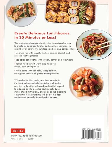 Créez des lunchboxes délicieuses et nutritives pour toute la famille en seulement 30 minutes grâce à ce guide complet. Le livre propose des instructions faciles, étape par étape, pour réaliser six lunchboxes de base avec de nombreuses variations, comprenant plus de 125 recettes en couleurs vives pour rendre votre lunchbox visuellement attrayante. Découvrez comment préparer des bentos amusants et simples avec des plats comme du riz vapeur au poulet teriyaki, des sandwiches à la salade d'œufs, des nouilles ramen avec sauce à tremper, et un bento pique-nique avec des rouleaux de nori.