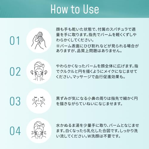 Pour utiliser, prenez une quantité appropriée du baume sur les mains et le visage secs. Décomposez légèrement le baume avec vos doigts et étalez-le sur tout le visage. Mélangez avec le maquillage et les impuretés en effectuant un mouvement circulaire. Ajoutez un peu d'eau ou d'eau tiède et mélangez jusqu'à ce que le baume devienne blanc et émulsifié. Enfin, rincez abondamment pour laisser la peau rafraîchie et nettoyée.