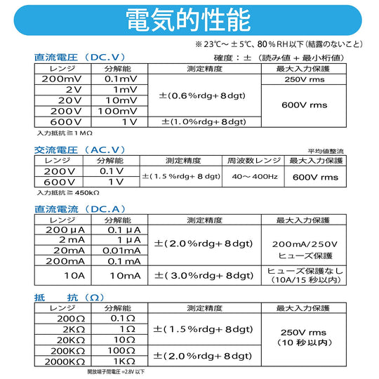 Ce multimètre numérique polyvalent est conçu pour diagnostiquer les dysfonctionnements des produits électriques et vérifier la durée de vie des piles. Il est doté d'un large commutateur rotatif facile à utiliser et inclut une fonction de vérification des transistors. Son interface avec une notation japonaise facile à lire le rend accessible à un large éventail d'utilisateurs.