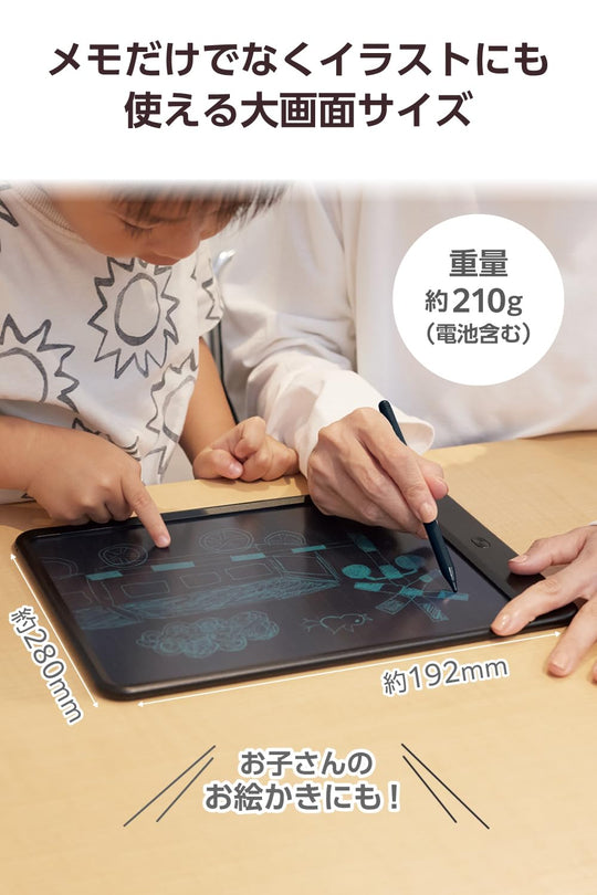 Écrivez, effacez et réutilisez avec ce mémo numérique de 12 pouces. Son écran large est idéal pour les notes, les illustrations et les dessins d'enfants. Effacez l'écran d'une simple pression sur le bouton central de l'appareil. Pour éviter l'effacement accidentel d'informations importantes, une fonction de verrouillage coulissant est incluse. Sa structure solide se caractérise par un design de boîtier intégré et un film haute résistance, testé pour 100,000 cycles de durabilité. Le stylet inclus est ergonomique pour une prise en main facile et une écriture précise. Une sangle dédiée aide à éviter la perte du stylet. L'appareil fonctionne avec une seule pile au lithium en forme de pièce de monnaie, facilement remplaçable. Ce produit respectueux de l'environnement répond aux normes de certification environnementale et est emballé de manière durable.