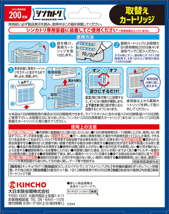 ```fr.csv Description du Produit Découvrez le répulsif nouvelle génération contre les moustiques, conçu pour être placé simplement dans votre pièce afin d'éliminer efficacement les moustiques. Ce produit innovant ne nécessite aucune alimentation électrique, ce qui en fait une option sûre et pratique sans souci de risques d'incendie. Il est conçu pour créer un espace sans moustiques sans effort, avec une unité couvrant une superficie équivalente à 6 tatamis. Le produit est inodore et hypoallergénique, ce qui le rend adapté aux foyers avec enfants et animaux de compagnie. Il est parfait pour les salons, chambres et chambres d'enfants. Spécifications du Produit Le paquet inclut une cartouche chimique et un contenant dédié. Le produit utilise le système unique de diffusion chimique sans chauffage de KINCHO, connu sous le nom de Technologie de Diffusion par Circulation d'Air, qui utilise le flux d'air de la pièce pour diffuser l'agent répulsif. Il offre jusqu'à 200 jours de protection avec une utilisation de 12 heures par jour, ou 300 jours avec une utilisation de 8 heures par jour, totalisant 2400 heures d'efficacité. Ingrédients L'ingrédient actif est la Pyréthroïde (trans-flutrin 7,0%), accompagné de résine polyoléfinique et de deux autres ingrédients. Mode d'emploi Pour une efficacité optimale, placez le produit face au vent d'une fenêtre ou dans des zones avec courant d'air. Il fonctionne mieux lorsque des climatiseurs ou des ventilateurs sont utilisés pour faire circuler l'air. Pour l'utiliser, ouvrez le sachet et retirez la cartouche chimique. Notez la date de remplacement sur la cartouche, puis insérez-la dans le récipient spécial jusqu'à entendre un clic. Le produit est activé lorsque le récipient est debout et désactivé lorsqu'il est placé à l'envers. Le contenant est réutilisable et la cartouche doit être remplacée par une cartouche de rechange vendue séparément après sa durée de vie utile. Conseils de Sécurité Lisez toujours l'étiquette du produit avant utilisation et conservez la boîte pendant l'utilisation. Utilisez uniquement avec le récipient spécial conçu pour ce produit. Ne touchez pas ou ne retirez pas le contenu directement, et n’utilisez pas le produit pendant plus de 8-12 heures par jour. Assurez une bonne ventilation dans les pièces fermées ou petites et évitez l'exposition directe au soleil ou aux hautes températures. Ne pas utiliser à proximité de feux ou dans des aquariums avec poissons d'ornement. En cas de contact avec le contenu, rincez abondamment avec de l'eau et du savon. Soyez prudent si vous avez des allergies et remplacez la cartouche à la fin de sa durée de vie utile. Suivez les instructions gouvernementales locales pour l'élimination. Précautions de Stockage et de Manipulation Conservez le produit dans un endroit frais, à l'abri de la lumière directe du soleil et hors de portée des enfants. Si non utilisé pendant une période prolongée, retirez la cartouche du récipient, remettez-la dans son sac d'origine et scellez avec du ruban adhésif. ```