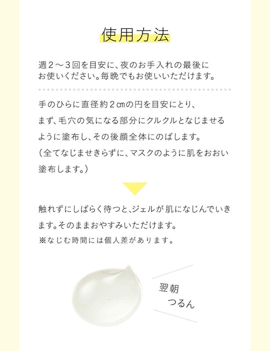 Utilisez le gel 2 à 3 fois par semaine à la fin de votre routine de soins du soir, ou tous les soirs si vous le souhaitez. Appliquez sur les zones avec des pores visibles en effectuant des mouvements circulaires, puis étalez sur l'ensemble du visage comme un masque. Laissez le gel se fondre dans la peau avant de dormir. Le temps de fusion peut varier.