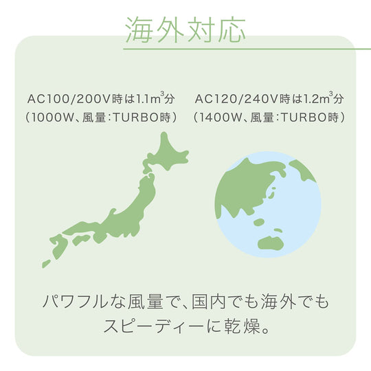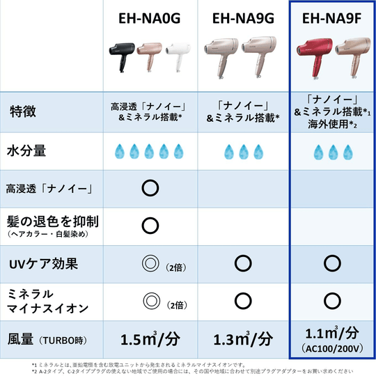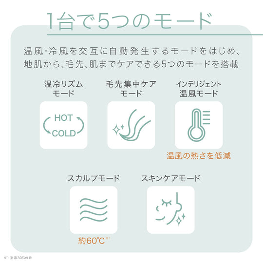 Ce sèche-cheveux utilise des "nanoe" et des minéraux*1 pour améliorer l'adhérence des cuticules, ce qui permet d'obtenir des cheveux faciles à coiffer et à démêler. Il est équipé de cinq modes qui peuvent être utilisés pour ajouter de la brillance et prendre soin de la peau et peut facilement être commuté entre 100-120V/200-240V pour une utilisation à l'étranger.