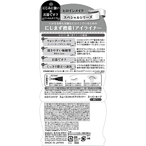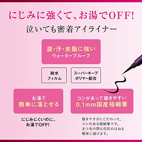 यह उत्पाद एक टिकाऊ आईलाइनर है जो गर्म पानी लगाने के बाद भी धुंधला नहीं होता है। इसमें एक नया सुपर कीप पॉलीमर फ़ॉर्मूला है जो आँसू, पानी और सीबम से पूरी तरह से सुरक्षा करता है, जिससे आँख के अंदरूनी कोने से बाहरी कोने तक लंबे समय तक एक साफ़ रेखा बनी रहती है, बिना धुंधला या छीले। आईलाइनर 0.1 मिमी अल्ट्रा-फाइन ब्रश से लैस है, जिससे कोई भी इसे आसानी से खींच सकता है। चमकदार जेट-ब्लैक रंग आपकी आँखों को एक आकर्षक रूप देता है। किसी भी रंग का उपयोग नहीं किया जाता है, जिससे त्वचा पर कोई रंजकता नहीं होती है। इसमें आँखों के क्षेत्र को मॉइस्चराइज़ करने के लिए 4 प्रकार के ब्यूटी एसेंस तत्व (हयालूरोनिक एसिड, कोलेजन, जंगली गुलाब का अर्क, पैन्थेनॉल) शामिल हैं।