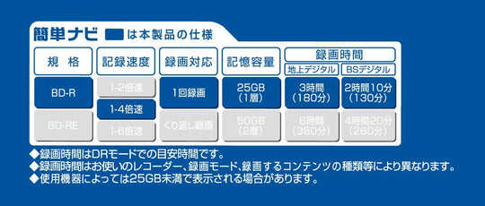 यह ब्लू-रे डिस्क सिंगल-टाइम रिकॉर्डिंग के लिए डिज़ाइन की गई है, जो इसे आपकी पसंदीदा डिजिटल सामग्री को कैप्चर करने और संग्रहीत करने के लिए आदर्श बनाती है। यह स्थलीय डिजिटल प्रसारण के लिए 180 मिनट और बीएस डिजिटल प्रसारण के लिए 130 मिनट का रिकॉर्डिंग समय प्रदान करता है। डिस्क की क्षमता 25GB है, जो सिंगल-साइडेड और सिंगल-लेयर्ड है। यह 4x रिकॉर्डिंग स्पीड को सपोर्ट करता है और विस्तृत प्रिंटिंग के लिए इंकजेट प्रिंटर के साथ संगत है, जिसमें एक सफ़ेद प्रिंट करने योग्य सतह है। पैकेज में एक सुविधाजनक स्पिंडल केस में 50 डिस्क शामिल हैं।