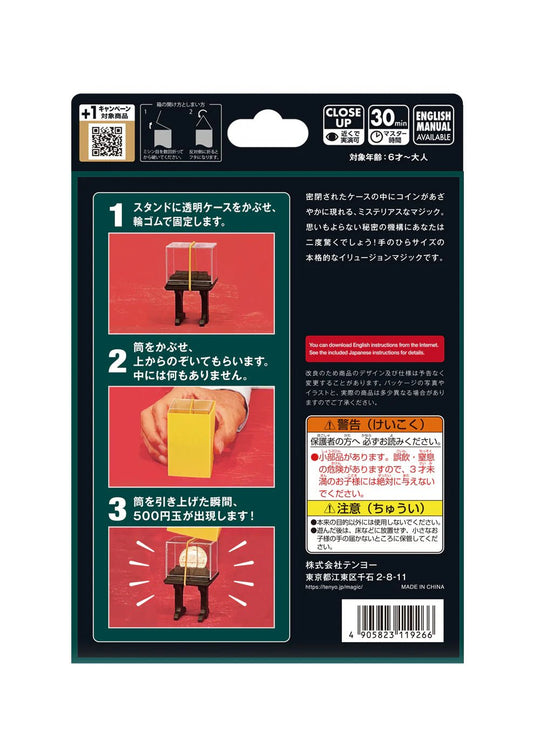 Cukup siapkan meja kecil, tutupi dengan kotak transparan, dan amankan dengan karet gelang yang disertakan. Letakkan tabung di atas kotak dan tunjukkan bagian dalam yang kosong kepada penonton. Saat Anda mengangkat tabung, koin 500 yen asli akan muncul di dalam kotak yang tertutup, menciptakan momen sulap yang mengejutkan dan berkesan.
