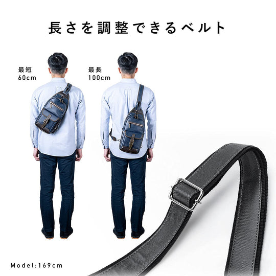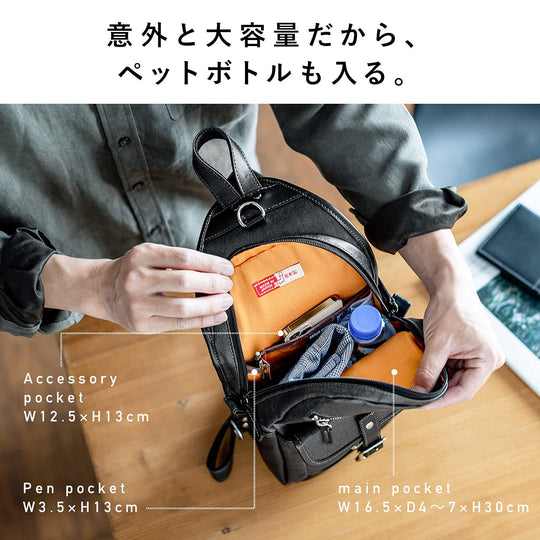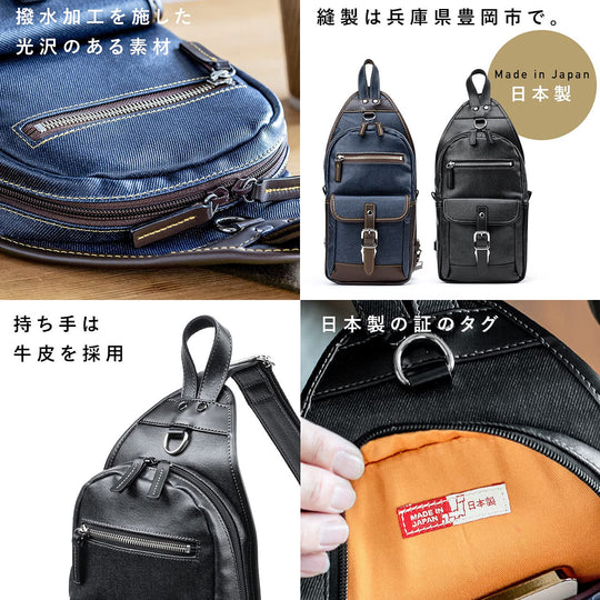 Tas selempang satu bahu ini dirancang untuk penggunaan yang fleksibel, bisa dipakai di punggung atau di depan. Dibuat di Jepang, tas ini menggunakan denim berkualitas tinggi dari Okayama dan diproduksi di Toyooka, daerah yang terkenal dengan pembuatan tas. Tas ini terbuat dari kain denim yang tahan lama dengan lapisan anti air, memberikan perlindungan terhadap hujan, noda, dan pudar warna. Denim ini berasal dari Kojima, Okayama, yang dikenal sebagai tempat lahirnya jeans domestik, dan dijahit dengan ahli di Toyooka, Prefektur Hyogo.
