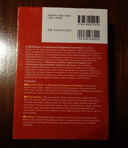 Buku ini merupakan volume ketiga dalam seri, mengikuti "A Dictionary of Basic Japanese Grammar" dan "A Dictionary of Intermediate Japanese Grammar." Isinya mencakup sekitar 230 butir tata bahasa Jepang tingkat lanjut, menjadikannya sumber yang sangat penting bagi pelajar dan instruktur bahasa Jepang tingkat lanjut. Kamus ini disesuaikan untuk mereka yang berkecimpung dengan materi tingkat lanjut, termasuk koran, jurnal profesional, dokumen teknis/bisnis/hukum, makalah akademik, dan literatur.